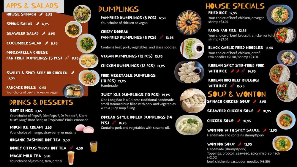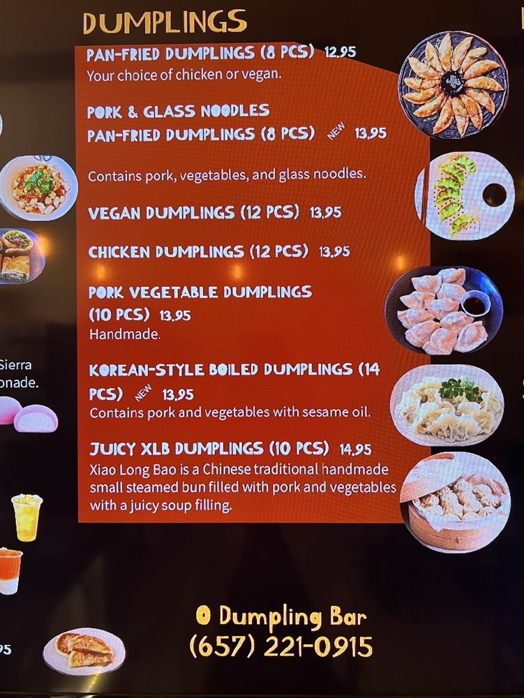 Introducing the menu at O Dumpling Bar, a Pan-Asian Chinese restaurant in Orange, CA, known for its exceptional service and delicious food. Offering a range of options for vegans and limited vegetarian choices, this restaurant also provides delivery, takeout, and reservations. With amenities like outdoor seating, free Wi-Fi, and wheelchair accessibility, O Dumpling Bar caters to a diverse clientele. Customers rave about the friendly staff, fresh ingredients, and calm ambiance. Standout dishes include the cucumber salad and flavorful dumplings. While prices may be a bit higher, the quality of the food makes it worth every penny. Whether you dine in or order to go, O Dumpling Bar promises a memorable culinary experience that will leave you wanting to come back for more.
